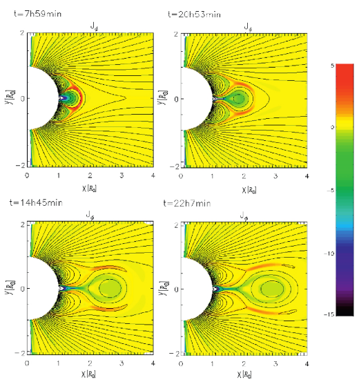 Snapshots showing the current density and magnetic field lines at different times in our simulations. The top left panel shows the reconnection sites in front of the first eruption at time t = 7h59min. The top right panel shows the reconnection sites for the second eruption at t = 20h53min. Both these snapshots are for the simulation with a shear region of