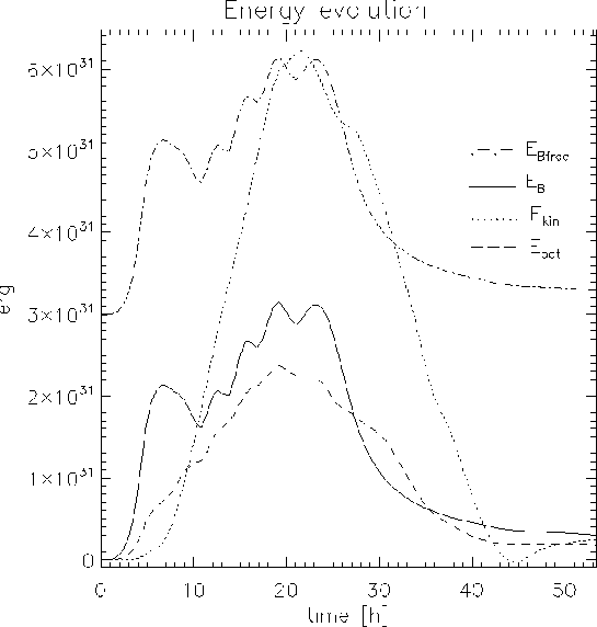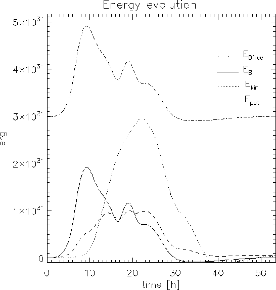 erg is added to the system within the first 9 h. At this point the energy available in the system suffices to drive an eruption and convert magnetic free energy into kinetic energy. This kinetic energy increases until 23 h. While the magnetic free energy is decreasing due to this conversion mechanism, we are still shearing the foot points and in effect continuing to pump free magnetic energy at the boundary. The balance between these two effects results in the local minimum of free magnetic energy after about 17 h. After this point in the simulation, the free energy starts to increase again because the amount of energy we are pumping in the system is higher than the amount of free magnetic energy released. After 19 h a new maximum in magnetic free energy is seen, followed by a decrease that drives the second eruption. Between 22 h and 25 h, another balance between the energy pumped in the system due to the shearing motions and the energy released results in a plateau. Finally, the remaining magnetic free energy is released in the system.