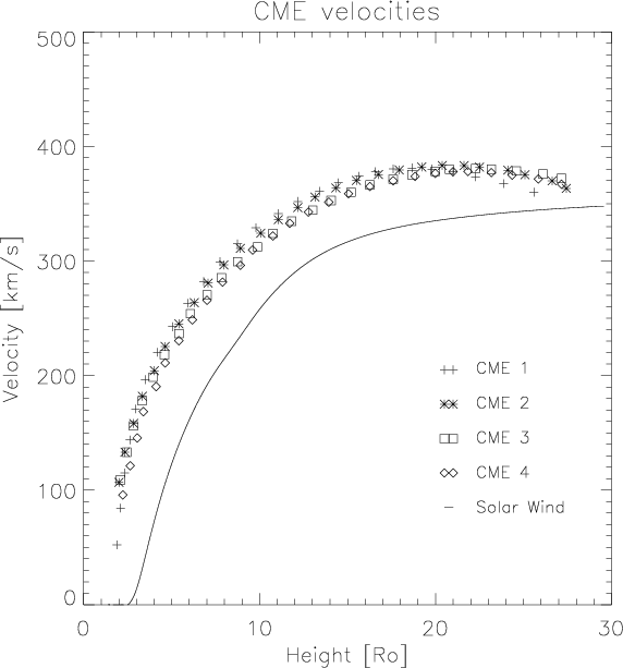 Figure 9: The velocities of the first four CMEs in the simulation with a shear region of 0.20 radians are shown. The first CME is accelerated towards 380 km s-1 and then decelerates towards the speed of our solar wind as it moves towards the edge of our numerical domain. The following CMEs are accelerated slightly slower, reach a similar maximum velocity, and then finally decelerate towards the solar wind velocity in that region. The solid curve represents the ambient solar wind speed in the equatorial plane. |