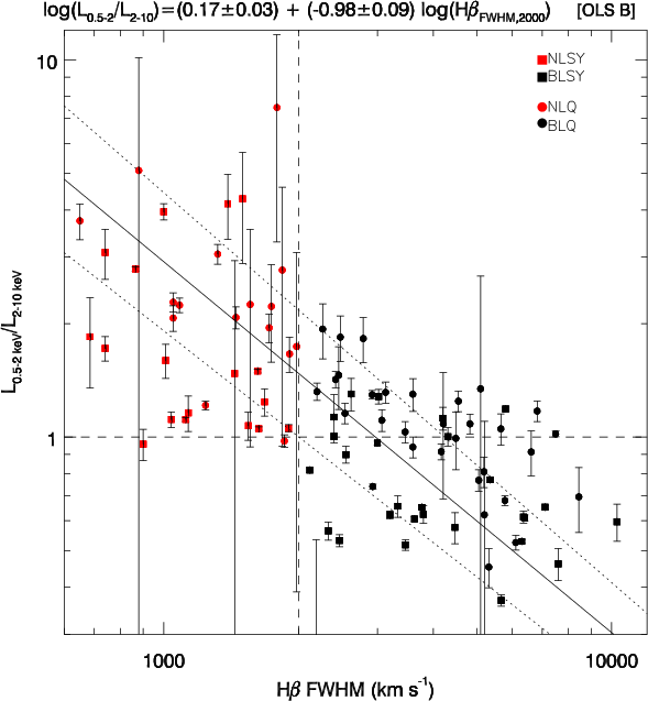 L0.5-2/L2-10 ratio lower than 1 and narrow- and broad-line objects are significantly different populations with respect to this parameter. However, just as no dichotomy appears in the optical properties between narrow- and broad-line objects, a smooth transition between high and low X-ray luminosity ratios is also apparent from the data. The best fit for the anti-correlation takes this form: