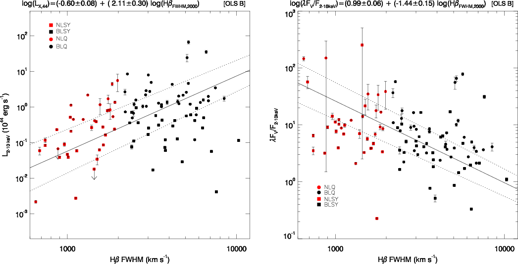 Left panel: hard X-ray luminosity vs. FWHM of H |