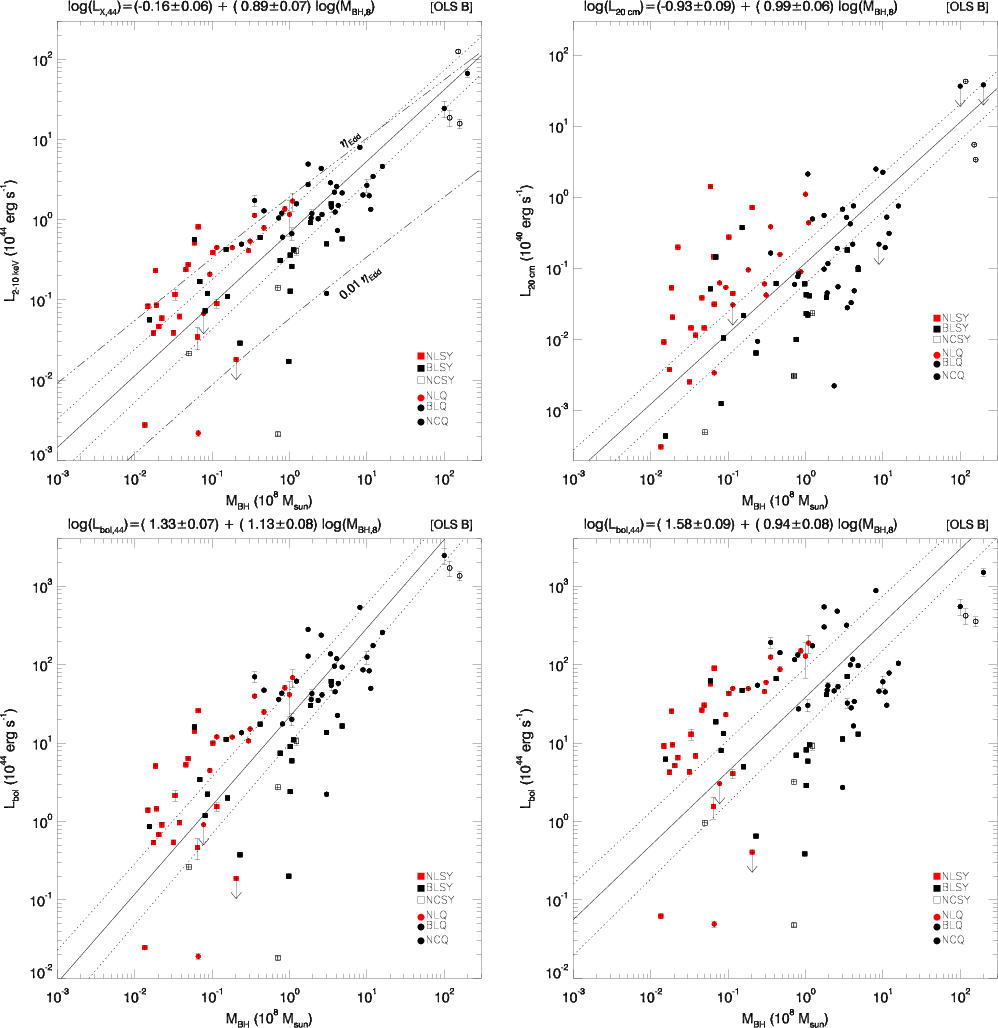 - Correlations with the BH mass. The strong correlation between the X-ray luminosity and the BH mass has a slope flatter than 1, suggesting that high-luminosity objects may be