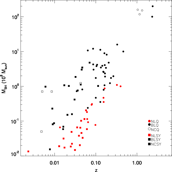 Two other significant correlations with BH mass are found in CAIXA. The first is the correlation between the BH mass and z (see Fig. 4). This is expected: if the efficiency of the conversion of gravitational energy into radiative output is the same for all AGN, the objects at high z, to be in CAIXA, must be luminous and, likely, with a large BH mass. Note that, at each redshift, narrow-line objects invariably have the smallest BH masses: this is well known and some authors believe that the masses in these objects are underestimated (e.g. Marconi et al. 2008; Decarli et al. 2008). This effect represents the other correlation with the BH mass found in CAIXA and can be explained in terms of the dependence of the