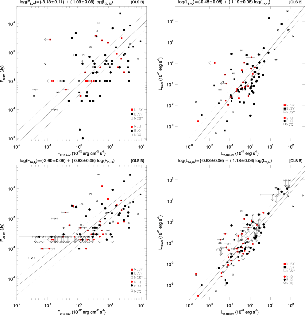 Since we are dealing with a large number of upper limits, we followed Guainazzi et al. (2006) to perform a linear fit, taking into account both upper limits and errors on the y parameter. Their method is an extension of the regression method on censored data described by Schmitt (1985) and Isobe et al. (1986) and can be summarized as follows. Several ordinary least squares Y vs. X (OLS Y/X) or bisector (OLS B) fits (each plot reports on the upper right which method was used) was performed on a set of Monte-Carlo simulated data derived from the experimental points according to the following rules: a) each detection was substituted by a random Gaussian distribution, whose mean is the best-fit measurement and whose standard deviation is its statistical uncertainty; b) each upper limit U was substituted by a random uniform distribution in the interval[0, U]. The mean of the slopes and the intercepts derived from the fits of each data set are our ``best fit''. Note that errors and upper limits on the x parameter are not considered in the procedure, although they are plotted. This does not affect the results significantly, given the fact that they are typically much smaller than the errors on the y. Moreover, the errors on the best fit parameters only take into account the experimental uncertainties, the dispersion of these parameters being within the Monte Carlo simulated datasets. Any intrinsic, physical scattering of the data points is not included. To test the significance of this anti-correlation, we calculated the Spearman's rank coefficient for each Monte Carlo simulated dataset; the mean value is taken as the Spearman's rank coefficient of our ``best fit''.