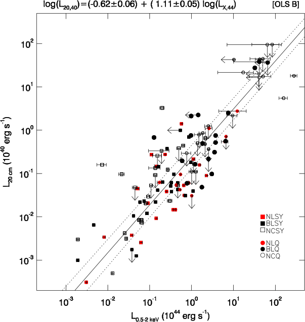 in agreement with previous results (Wang et al. 2009). This flatter slope could suggest that objects with larger BH masses have intrinsically lower accretion rates or are simply X-ray weaker with respect to their bolometric luminosity. On the other hand, the correlation with the radio luminosity (