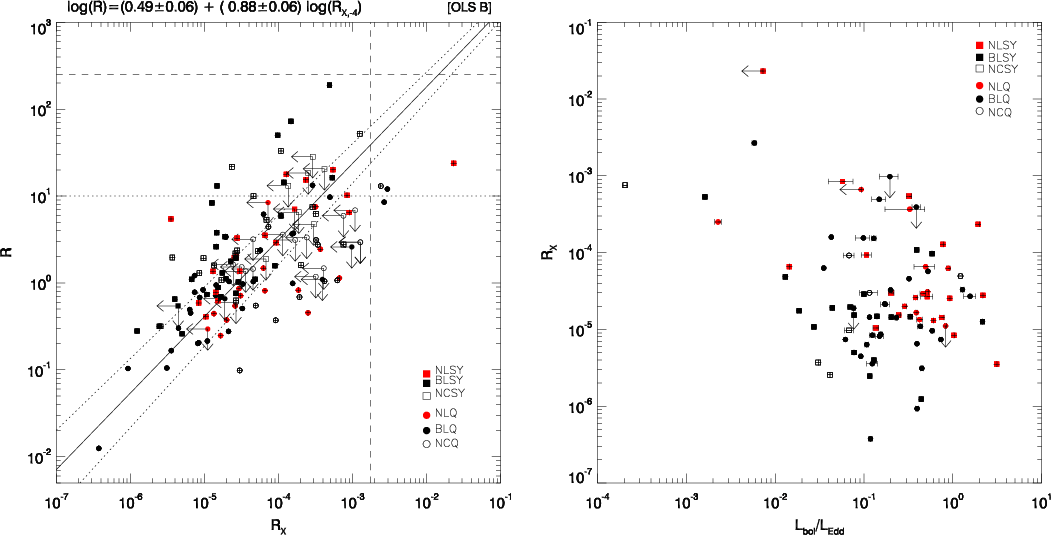 Figure 11: Left: radio-loudness parameter vs. X-ray radio-loudness parameter (see text for definitions) for all the sources in the catalogue with a radio measure. The dotted horizontal line represents the canonical separation between radio-loud and radio-quiet quasars, while the dashed lines the separation for Seyferts, based both on the optical as well as on the X-ray radio-loudness parameter (after Panessa et al. 2007). A linear regression fit is superimposed on the plot, along with the best fit parameters. We refer the reader to B09 for the detailed selection criteria adopted in CAIXA with respect to the radio-loudness. Right: X-ray radio-loudness parameter against Eddington ratio. Although a trend is observed, the anti-correlation is not statistically significant. See caption of Fig. 5 for details on the adopted symbols. |