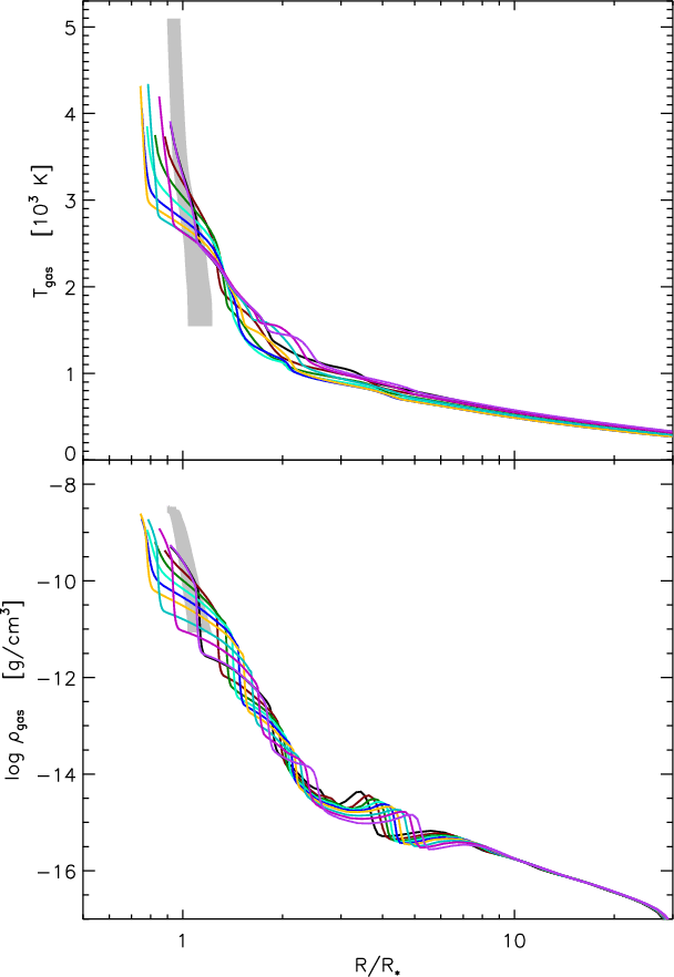 Dust formation (in this sample only amorphous carbon dust is considered) is treated by the ``moment method'' (Gail & Sedlmayr 1988; Gauger et al. 1990), while