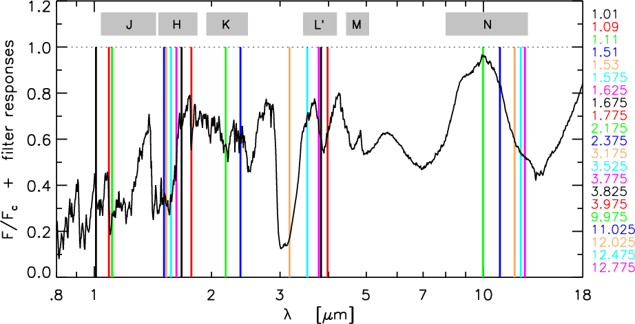 - In principle, this should be done monochromatically but for computational reasons the usual number of narrow-band subfilters was limited to 10. However, we compared the resulting broad-band filters computed with a set of 10 narrow-band subfilters with the one computed with a set of 100 and 200 subfilters without finding any significant difference in the resulting broad-band visibility profile. We also emphasise that the maximum resolution for the computation of the broad-band filter is given by the opacity-sampling resolution.