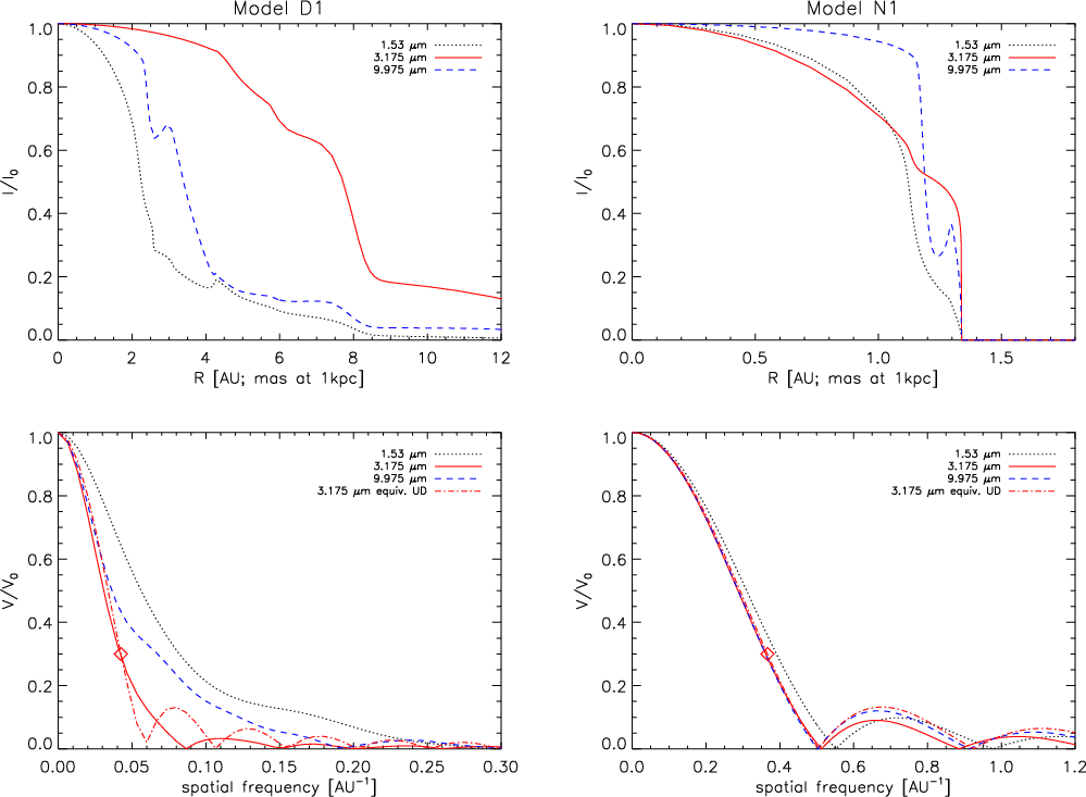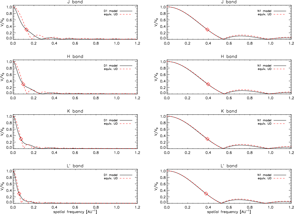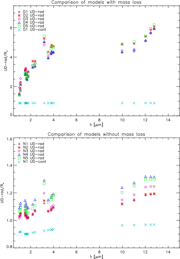 - The difference in the UD-radii between the models should be detectable observationally, in particular in the L-band where MATISSE (Lopez et al. 2006) will provide new observational opportunities.