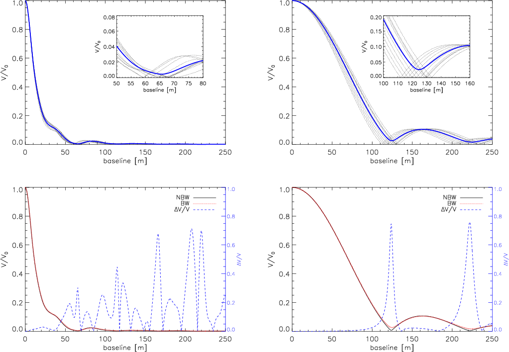 - Bandwidth smearing affects the resulting broad-band profiles with an error of about 70% for certain baselines. For models with mass-loss, the difference is notable not only close to the first zero but also on the flank of the first lobe of the visibility profile. When comparing models with observations in broad-band, it is important to take this effect properly into account.