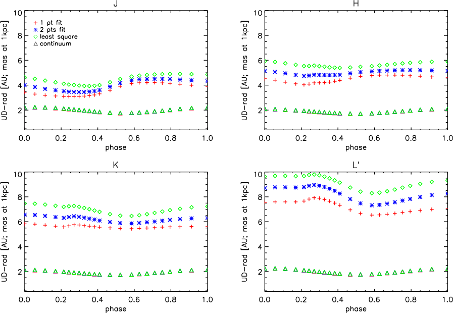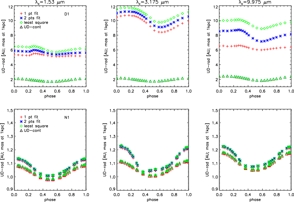 m and in the N-band, the star appears more extended because of C2H2 opacity. The UD-continuum radius is mostly independent of the wavelength and phase.