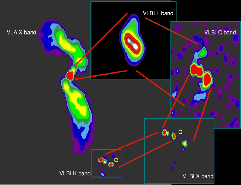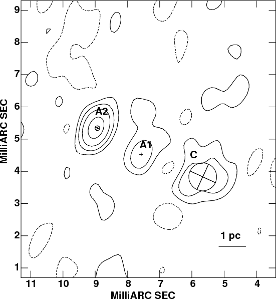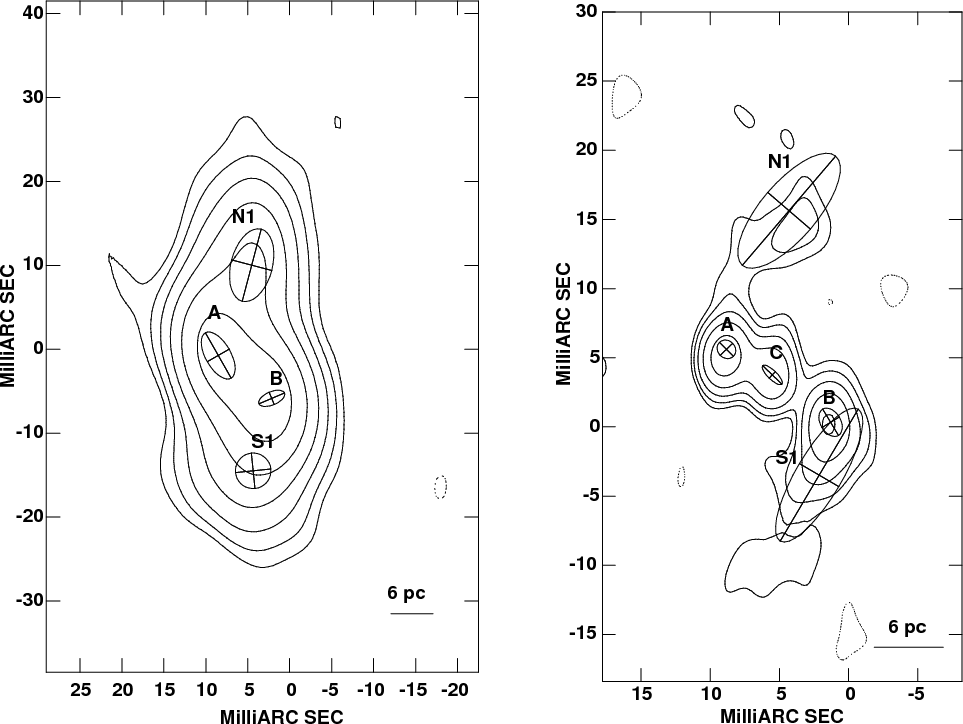 30 mas. At 5 GHz the two central components of the low resolution images are resolved into three components (A, C and B; see Fig. 1, right). The symmetric S1 and N1 lobes are still visible though with an extension of only