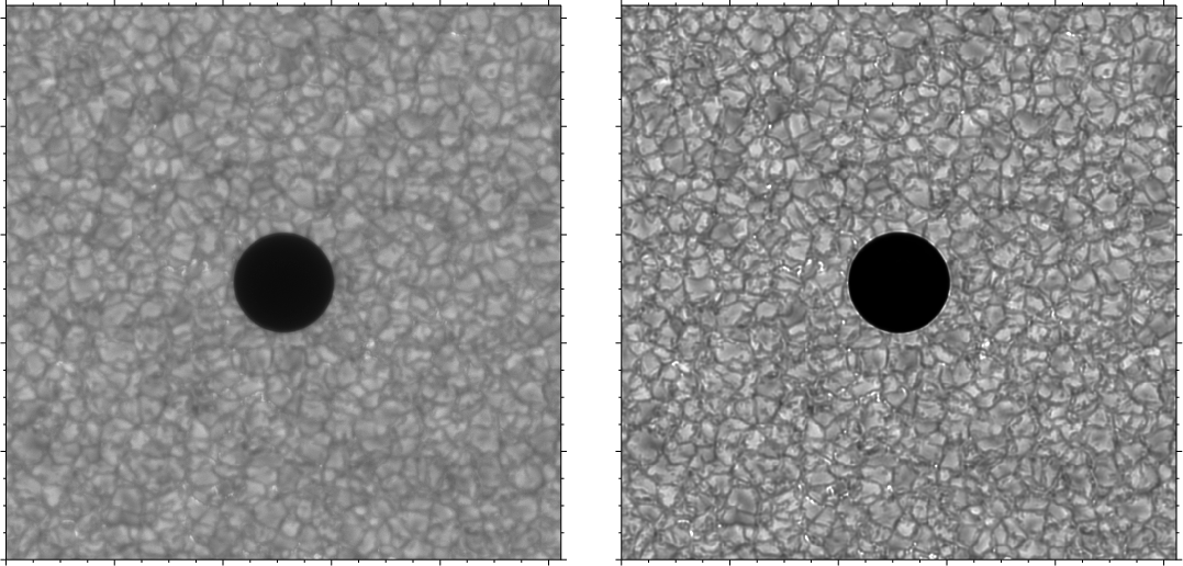 Observed ( left) and corrected ( right) G-band images. Each tick mark corresponds to |