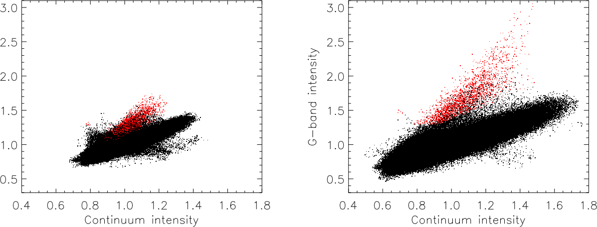 Figure 4: Distribution of the G-band intensity versus blue continuum intensity. Red points correspond to BPs, black dots to the remaining features. All intensity values are normalized to the average intensity of that wavelength band. Left frame: before and right frame: after deconvolution of the PSF. |
