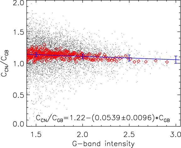 Ratio of BP contrasts in the CN-band and in the G-band versus the