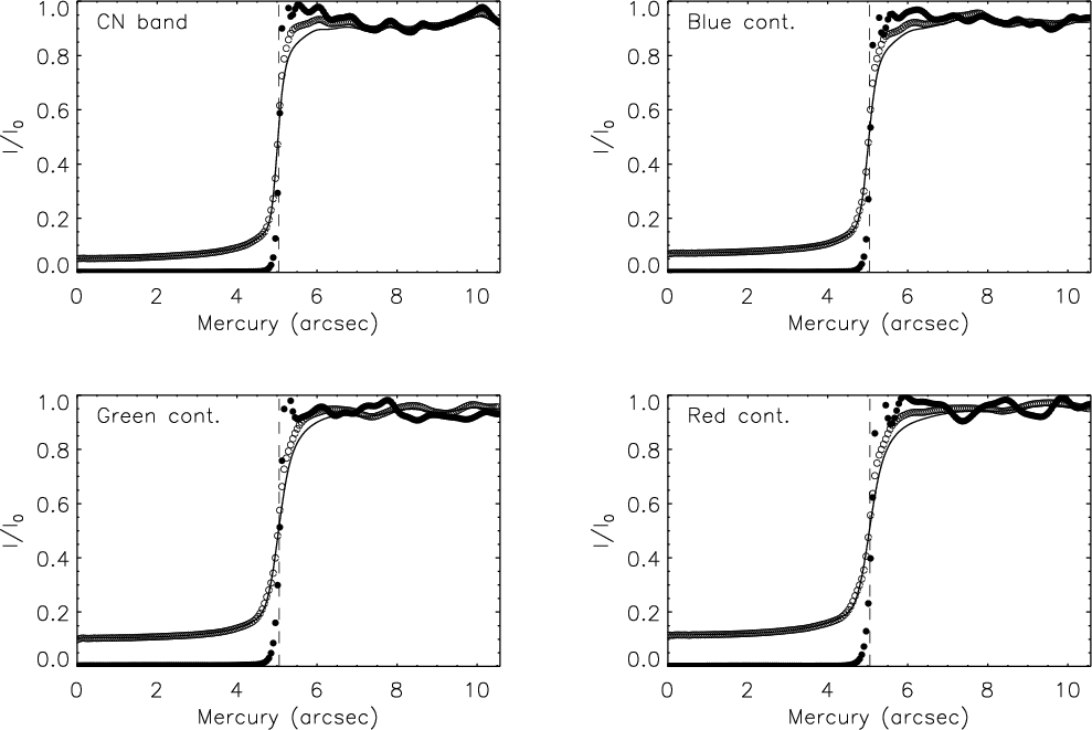Figure A.1: The fit to the radially averaged Mercury intensity profiles for CN-band, blue continuum, green continuum, and red continuum wavelengths. Open circles outline the observed intensity profile, the solid line represents the fit to the observed profile and filled circles follow the intensity profile after correction. The vertical dashed line marks the Mercury's limb. |