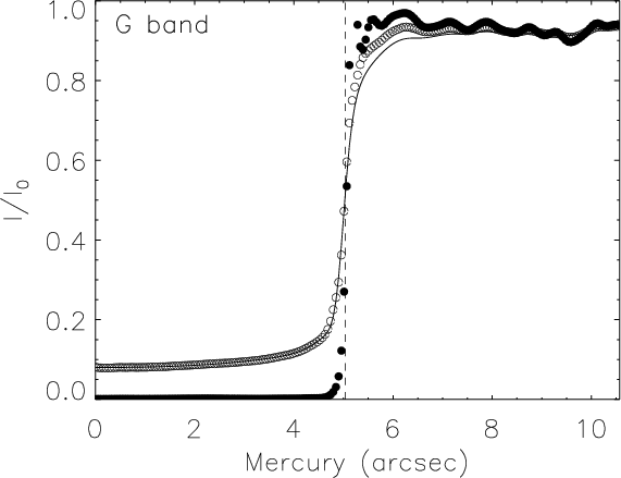 Figure 1: The fit to the radially averaged Mercury intensity profile. Open circles outline the observed intensity profile, the solid line represents the fit to the observed profile and filled circles follow the intensity profile after correction. The vertical dashed line marks Mercury's limb. The ripples in the intensity profile outside Mercury's image are mainly due to the average intensity variations in the granules. |