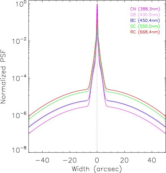 Figure 2: PSF for different wavelengths observed by Hinode/SOT/BFI. The corresponding values for the weights and widths of the Gaussian functions are given in Table 1. |
