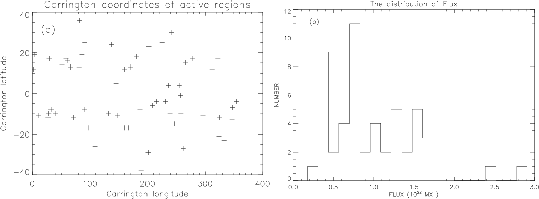Figure 1: Panel a) is the Carrington coordinates of the active regions and panel b) is the flux distribution of the active regions. |