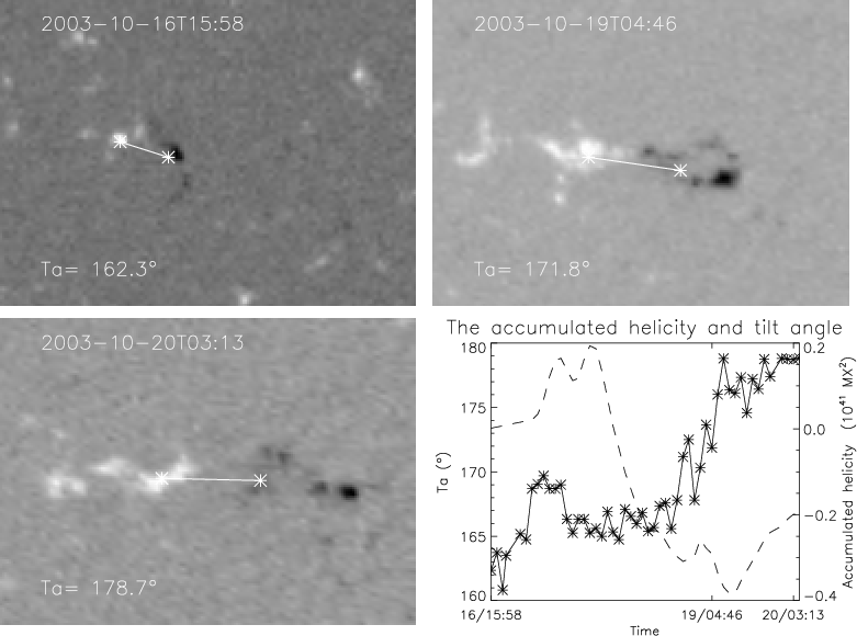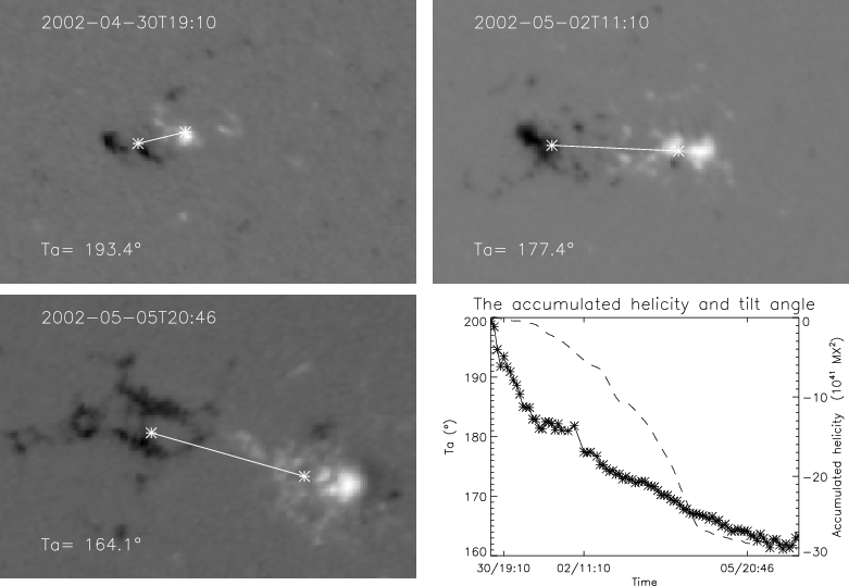 Figure 4: AR09931: an example of active regions belonging to the group A. The top and bottom left images reflect the evolution of this active region at three different moments of time. The tilt angle (Ta) is given. The bottom right plot shows the temporary evolution of accumulated magnetic helicity and tilt angle. The left ordinate of this plot corresponds to the tilt angle (asterisk) and the right is accumulated helicity (dashed line). |