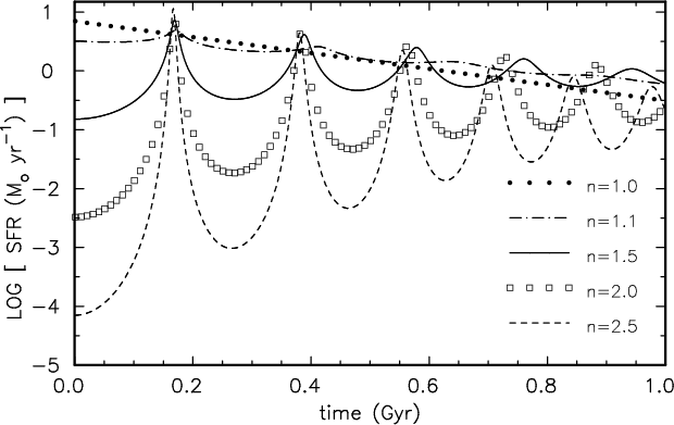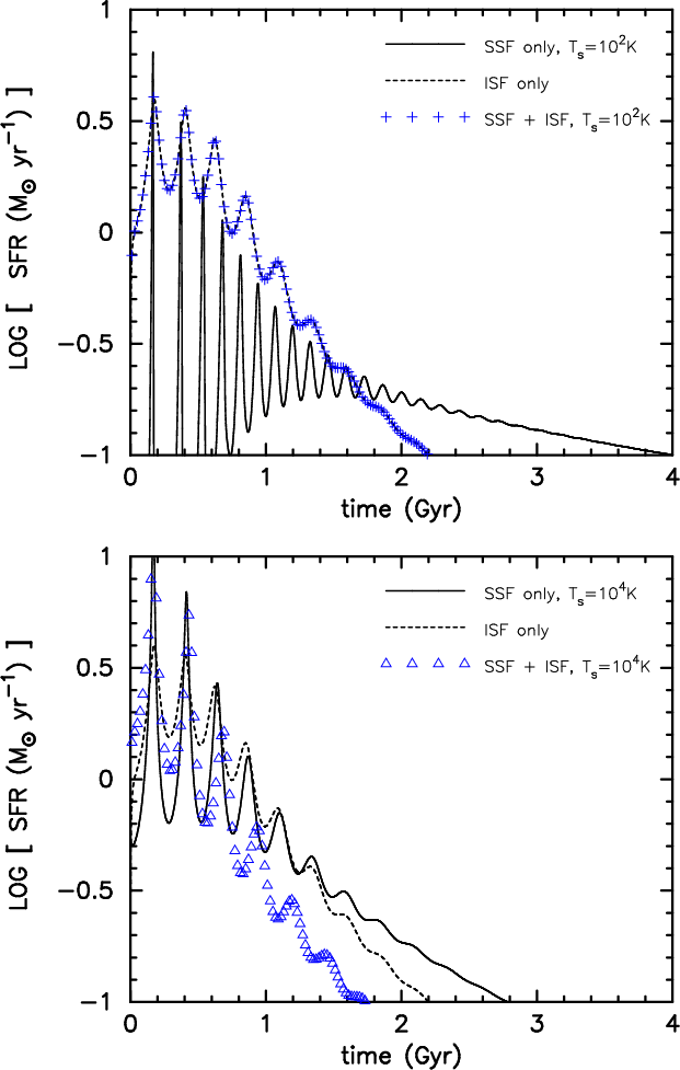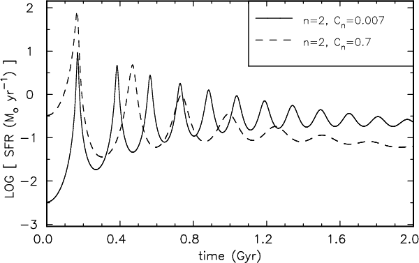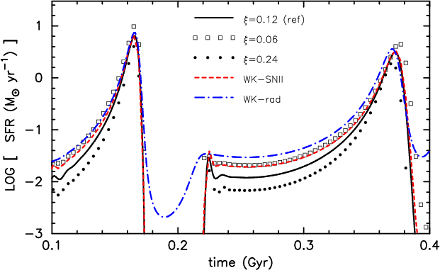 The overall star formation peaks in PWI04 are much smaller than in our calculations (by one order for a fiducial model including a feedback term). This might be caused by the different initial set-ups, because the spherical configuration we study allows for a much deeper collapse than a rotationally supported disk. As a result, the density and, thus, the star formation variations are much higher in our case than for PWI04. For comparison, the full 1d chemo-dynamical models of Hensler et al. (2004, afterwards HTG04) model spherical galaxies (but without dark matter) and they exhibit SFR comparable to ours. Similar to our calculations, the models by HTG04 show a strong trend toward self-regulation that has also been found in the 3D chemo-dynamical N-body-SPH models of Berczik et al. (2002) including dark matter. The PWI04 models exhibit no strong starbursts as the moderate variation in their star formation rates shows (Figs. 4 and 6 in PWI04). In contrast to them we were looking for strong variations that are rarer, but that exist (van Zee 2001).