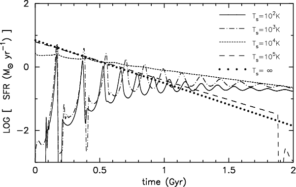 In our approach we adopted a single ISM phase. An extension to a multi-phase ISM model like in Köppen et al. (1998) would be possible and is envisaged. However, we do not expect significant changes, because the timescales related to the additional multi-phase ISM processes (like condensation, evaporation) are separated well from the other timescales: they are much longer than the dominant heating and cooling processes, so that thermal equilibrium is established rapidly and independently of the fractional ratio of clouds and intercloud gas. On the other hand, evaporation and condensation of clouds occur much faster than the gas consumption due to star formation. Thus, we expect that the system would again break down in a hierarchy of well-separated equilibria, and the related equilibrium SFR would thus still be governed by the equilibrium temperature in the cloud phase.