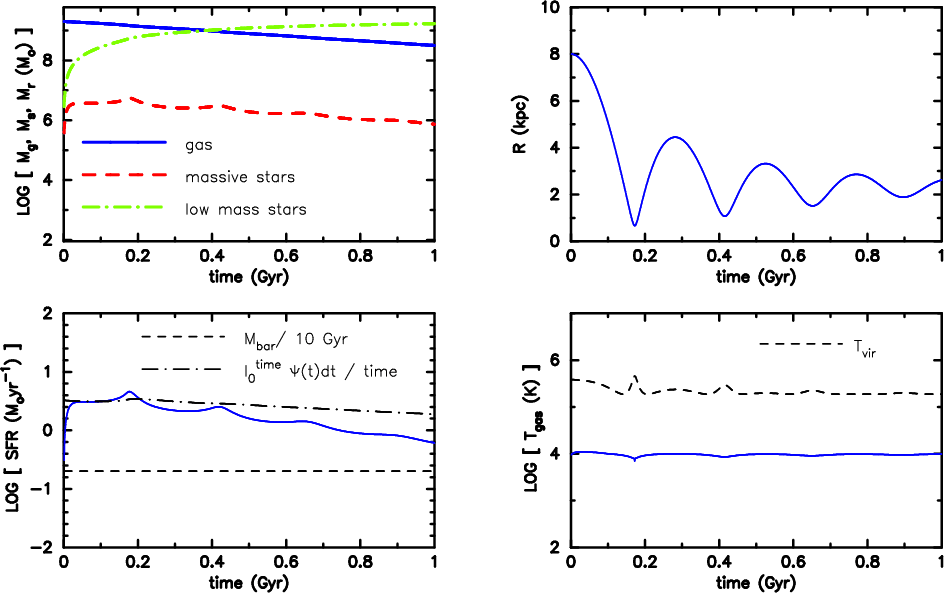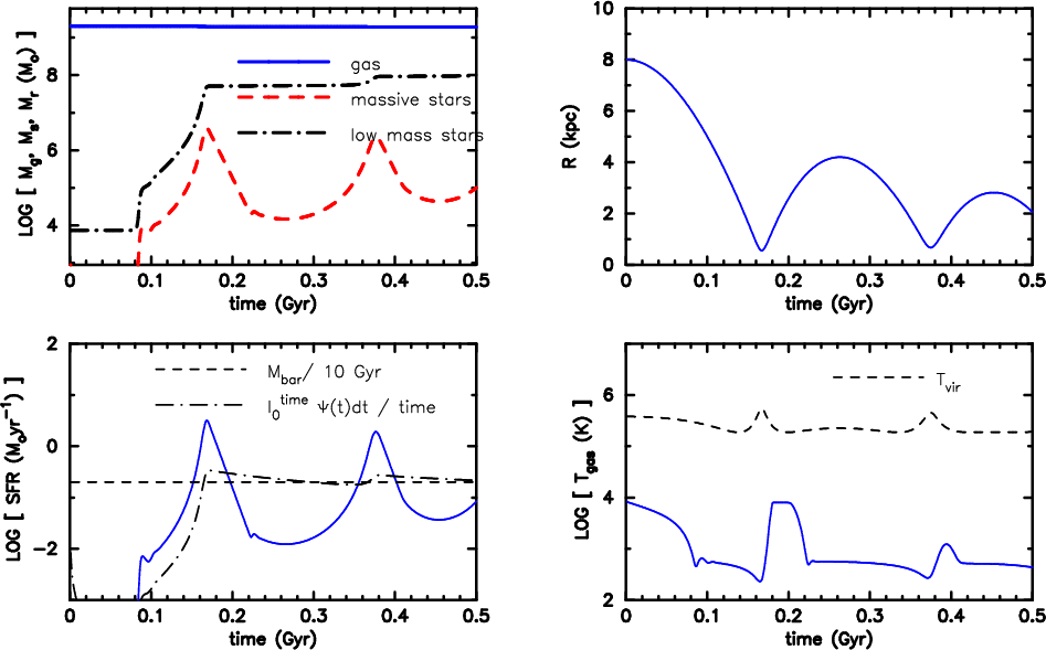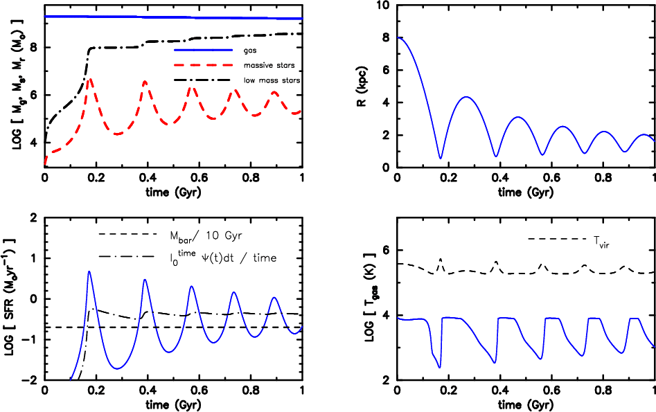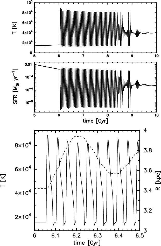 With all these differences in mind a detailed comparison is not meaningful, but a qualitative comparison should shed light on the applicability of our ansatz; e.g., Pelupessy et al. (2004, hereafter PWI04) model the evolution of a rotating disk-like dwarf galaxy embedded in a dark matter halo. They apply a sophisticated ISM model including heating, cooling and an ionisation/recombination scheme. Their SFR develops a quasi-periodic behaviour with a period of about twice the dynamical time for (weak) bursts. PWI04 interpret this behaviour as the result of a kick that drives the gas out of the disk and the subsequent fallback of the gas initiating the next star formation episode. This concept is very similar to our adopted coupling between feedback and dynamics, though we are investigating a spherical system.