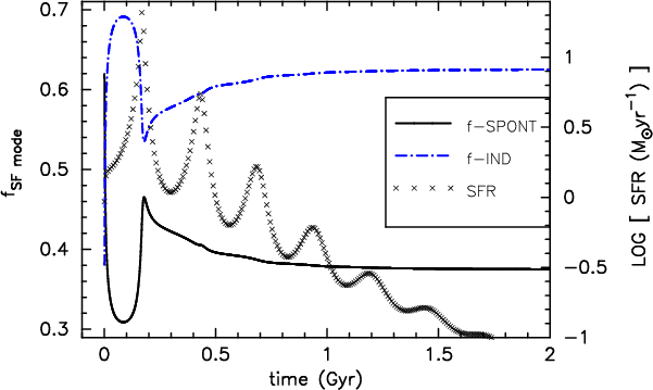 Another interesting example of SFR variability is the SPH simulation of Struck (2005, hereafter S05), who investigated the evolution of a disk galaxy of about 2