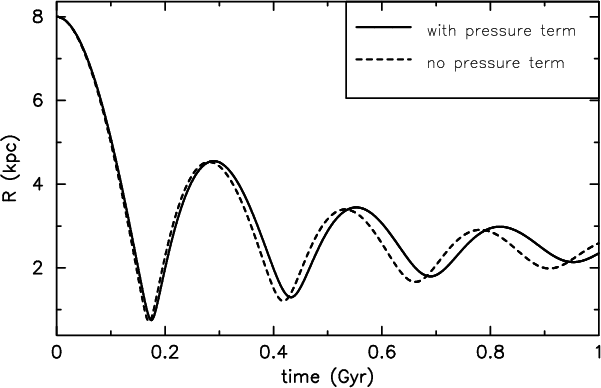 Therefore, the dynamics are almost unaffected by the thermal state of the gas. This is nicely illustrated in Fig. 16 where the mean radius of model DN1 is compared with a model neglecting the pressure term of Eq. (7): no substantial difference between both models is discernible. Small differences develop at maximum compression when the gravitational terms and the angular momentum almost cancel. For this short moment, the small pressure-gradient term contributes recognisably. It acts as a reduction of the gravity, e.g. like a density reduction, which results in slightly longer periods.