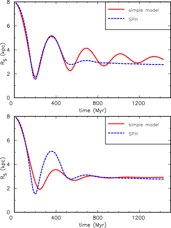 Figure 1: Temporal evolution of the half-mass radius in a 3D-SPH simulation of a collapsing gas sphere in a dark matter halo and the result for the simple equation of motion (7). Shown are models fitting the early stage well (with CP=1.91, Cj=0.15, Cf=2.06, left) or the late stage (with CP=1.97, Cj=0.11, Cf=0.88, right). |