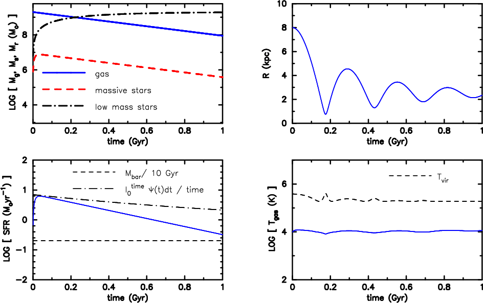 Motivated by the complex and computationally expensive chemo-dynamical calculations of Theis et al. (1992) (also used in the simulations for dwarf galaxies by Hensler et al. 2004), KTH95 analysed a set of closed-box models that was designed to be as simple as possible, but still keeps the main qualitative features of the chemo-dynamical network (e.g. feedback processes). These simplified equations describe the temporal evolution of the density of short-lived massive stars (s), of gas (g), and of the internal energy (e) of the gas: