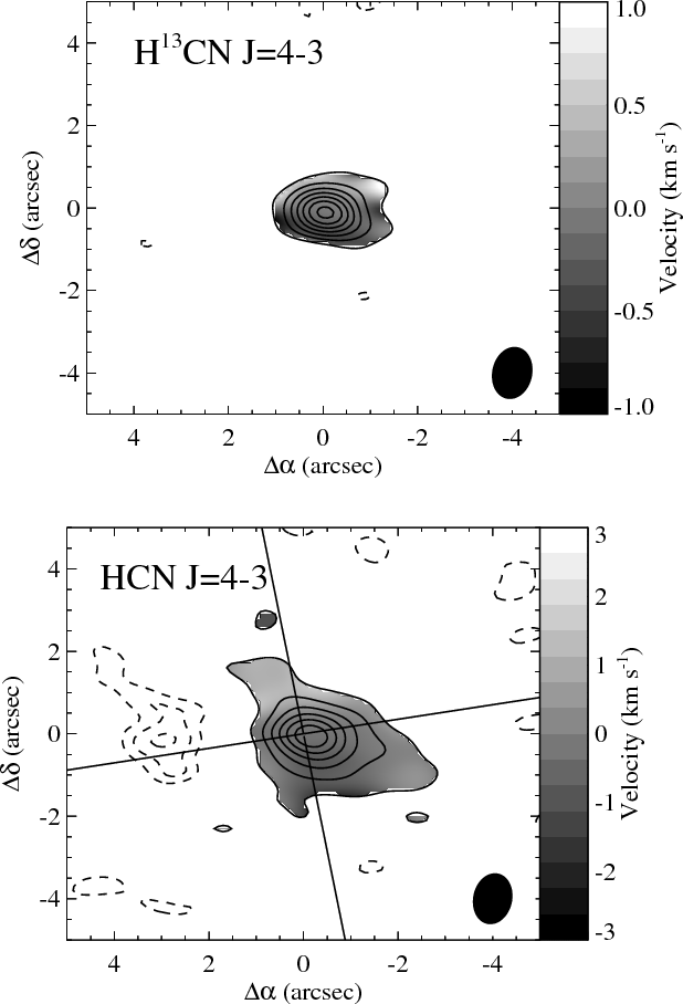 Zero (contours) and first (grey scale) moments of H13CN and HCN J= 4-3. Contour lines showing the integrated intensity begin at 3 |