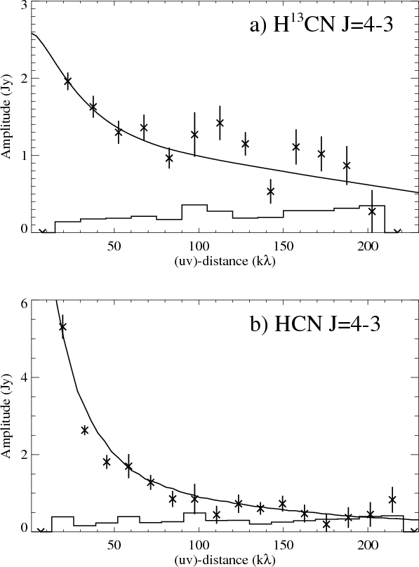 The histogram indicates the expectation values if no signal were present and the full line is our best fit model, which we discuss in Sect. 4. Panel b) has a similar layout, but for the HCN J= 4-3 line. For this line the emission is also well resolved on baselines below 80