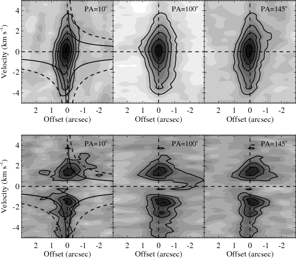 The first thing to notice is that the three position-velocity diagrams extracted for each of HCN and H13CN along the different spatial axes appear quite similar. There is no direction that obviously shows a clear rotation pattern and with the peak intensities at different velocities located exactly at zero offset, there is actually very little sign of the velocity gradient at all, except for small skew in the contours in the left-most panel of H13CN and emission at the 3-6 level at positive velocities in the center HCN panel. The black lines that are also plotted in Fig. 3 show Keplerian rotation profiles for a central mass of 0.3