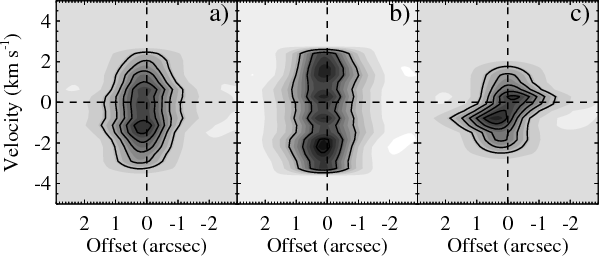 Figure 3 shows three position-velocity (PV) diagrams of both H13CN and HCN. The PV-diagrams show the emission contours along one spatial axis and a range in velocities. The three panels of Fig. 3 correspond to PV-diagrams along slices of different position angles. If only rotation is present, the PV-diagram along the axis of rotation should show no evidence of systematic motions, whereas the PV-diagram along the perpendicular axis should. The three axes for which we show PV-diagrams are chosen so that one coincides with the direction of the velocity gradient seen in Fig. 1 (the same direction as the north-south outflow), one perpendicular to this (coinciding with the east-west outflow), and one which is inclined with 45