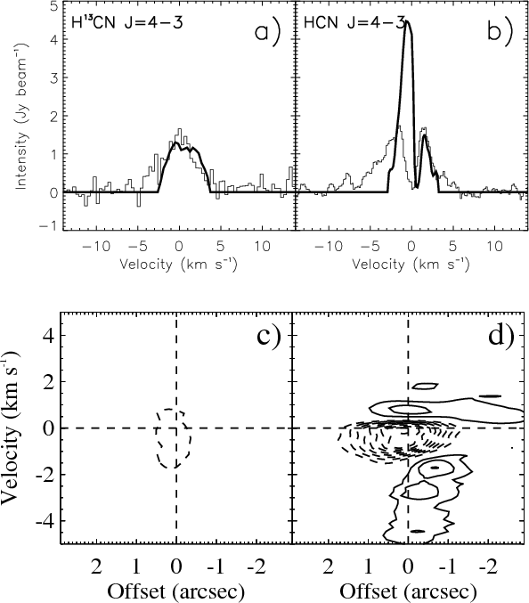 of that figure. The best fit model is seen to reproduce the features of the data well in terms of line intensities and emission distribution, while the model in panel b has too weak lines and the model in panel c shows a skewed emission distribution. The asymmetry seen in panel c is typical for a rotating velocity field and this feature is not seen at all in the data. A direct comparison between the SMA data and our model is shown in Fig. 7. Panels a) and b) show the fit to a single spectrum toward the center position of IRAS2A for H13CN and HCN respectively. The fit to the H13CN spectrum reproduces the entire line profile well. From the residual of the fit to the PV-diagrams (panel c) it can be seen that it is not only the center position that fits well. In the case of HCN, however, the best fit model does not work as well. While the red side of the spectrum is relatively well reproduced, also spatially, the blue side suffers from a too strong peak and a too narrow line wing. The line wing emission is most likely the outflow, similar to the wing seen in HCN J = 4-3 in Fig. 5. The strong asymmetry, predicted by our model, is not seen in the SMA spectrum, where the blue and the red sides peak at the same intensity. Because we do see the asymmetry in the single-dish lines, the missing blue peak is likely due the HCN line becoming optically thick on large scales where the interferometer filters out emission - and where our model does not necessarily apply, e.g., due to departures from the simple spherical power-law density profile or associated temperature profile.