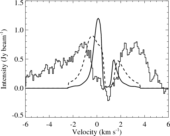 6 km s-1. Our model does not reproduce these velocities, and indeed, even if we increase the mass significantly, the line width only increases a little.