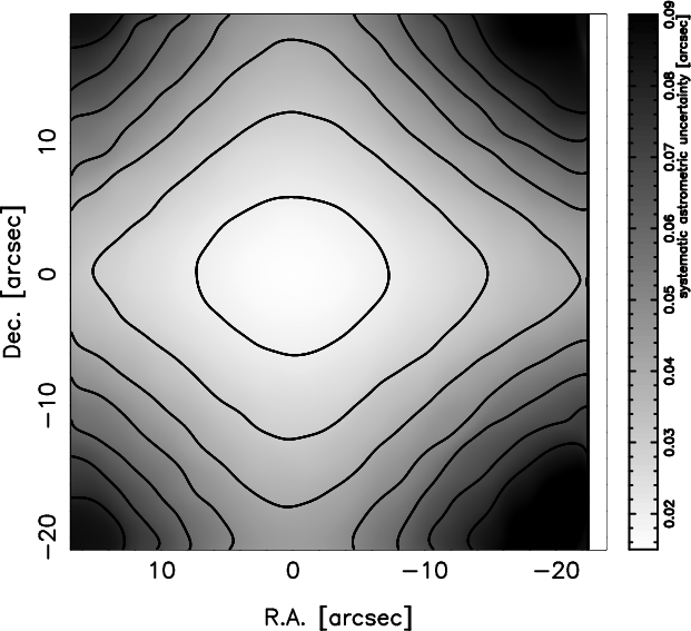 Note that the last step does not necessarily eliminate camera distortions. The final reference frame may therefore still have residual astrometric distortions. However the last step increases the precision of the stellar positions in the reference frame significantly. We created smooth maps of the positional uncertainties of the stars in the preliminary and final combined lists. As we show in Fig. A.2, the map of the uncertainty of the stellar positions in the final combined list reflects closely the two-dimensional stellar light density. This is exactly what one would expect after possible systematic offsets due to camera distortions have been eliminated successfully and the astrometry of the sources is almost exclusively affected by the structure of the stellar cluster itself. This provides and important cross-check for the validity of our determination of stellar positions in the reference frame.