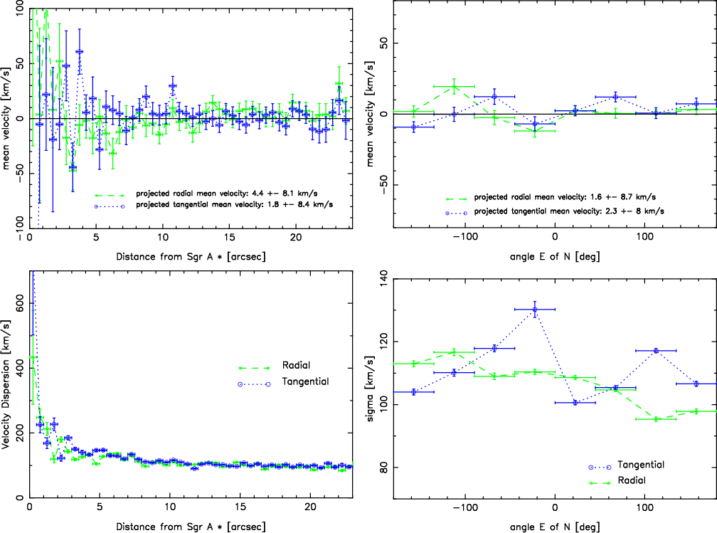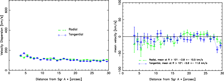 Figure B.3: Left: projected radial (green) and tangential (blue) velocity dispersions in the GC nuclear star cluster for the offset field (see Fig. 2). Right: mean projected radial and tangential velocities vs. projected distance from Sgr A* for the offset field. |
