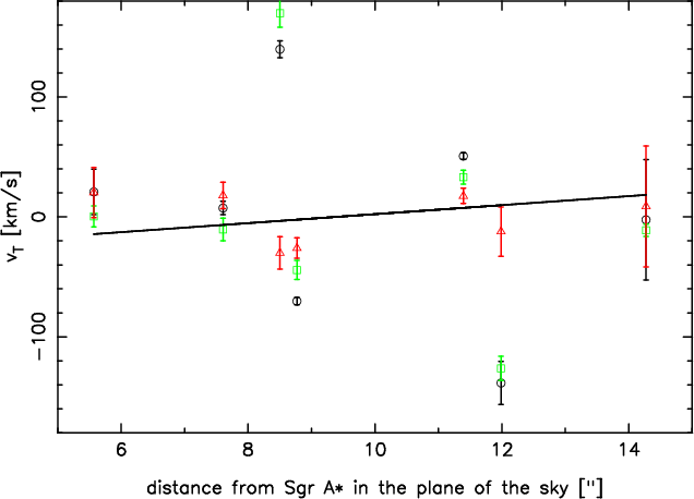 The methodology applied to extract proper motions from the offset data set was identical to the one for the central field, except that no astrometric positions for the stars were derived. The analysis of the offset proper motions is based on three epochs only (August 2004, July 2005, and May 2008). Stars that were not detected in all three epochs were rejected from the sample. The stellar positions were just transferred roughly into the radio reference frame by applying appropriate offsets. We estimate that the uncertainties of the stellar positions in the offset field may reach up to several 0.1''. Therefore the proper motions for the offset field are not included in the list in Table B.1. The distances of the stars from Sgr A* were measured by using the NaCo pixel scale.