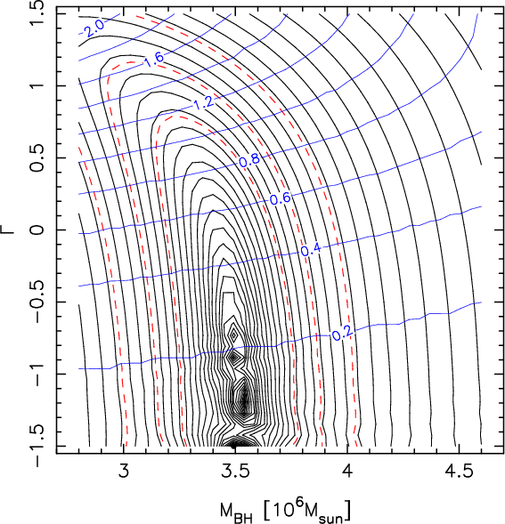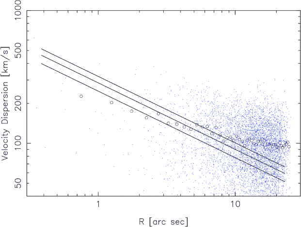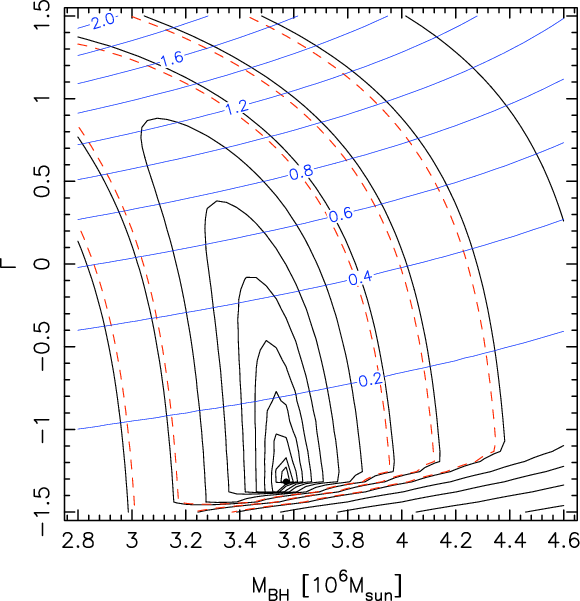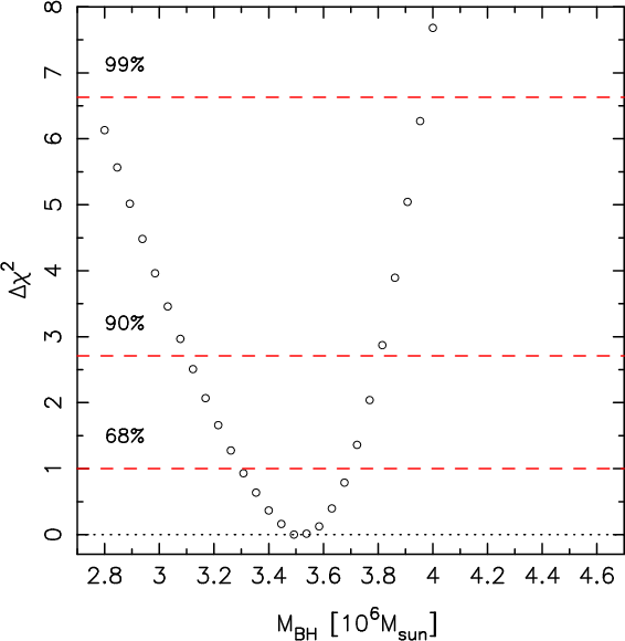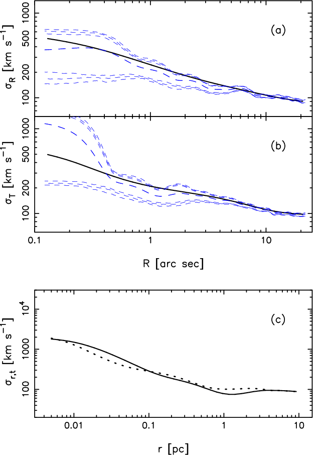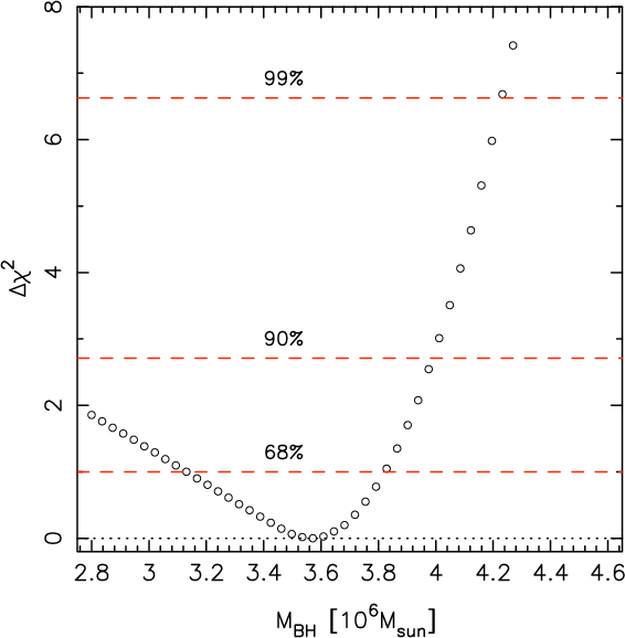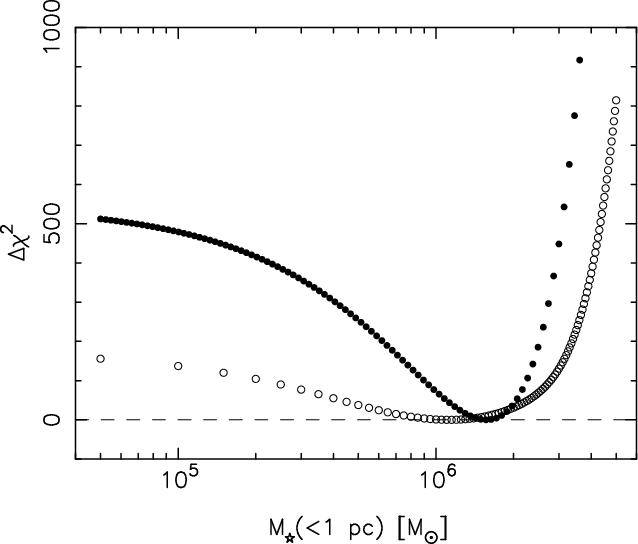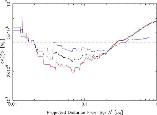 Due to the lack of data, estimates of the enclosed mass profile at the GC were up to now heavily influenced by modeling assumptions, such as adopting some ad hoc value for the velocity dispersion at large distances, or by estimates of the enclosed stellar and BH mass based on measurements of gas velocities (e.g., Schödel et al. 2002; Genzel et al. 1996). Schödel et al. (2007) have re-analyzed this issue and concluded that the mass of the star cluster in the central parsec is possibly significantly higher than previously assumed. Their claim is based on observational data that indicate that the measured line-of-sight velocity dispersion of late type stars within 0.8 pc of Sgr A* remains apparently constant, with a value around 100 km s-1(Zhu et al. 2008; Figer et al. 2003). This contrasts with the expectation that the velocity dispersion would show a Keplerian decrease over the entire central parsec if only the BH point mass were
