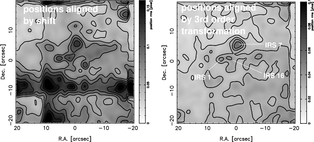 Figure A.3: Smooth maps of the positional uncertainty of the stars detected in the reference frame from 12 June 2004. The maps were created in the same way as the maps shown in Fig. A.2. The left panel shows the uncertainty of the stellar positions in the FOV after combining the lists of detected stars by applying just shifts in x and y coordinates (simple mosaicing). The right hand panel shows the uncertainties after aligning the stellar positions with the reference frame via a polynomial fit. The transformation reduces the overall uncertainty of the positions and eliminates systematic changes of the positional uncertainty due to camera distortions. The average combined uncertainty of all positions is 0.073 pixel before and 0.027 pixel after the polynomial fit. The overall uncertainty is lower than for the stars in the reference frame because the quality of the AO correction was much better in the observing run on 12 June 2004. Therefore, the correlation of the uncertainty after the polynomial transform with the density of stars and the presence of bright stars is less obvious than in the 2006 data. However, areas of increased positional uncertainty are clearly associated with the IRS 7, IRS 16, and IRS 1. Please note that the different scaling of the maps in the left and right panels. The vertical strip of low uncertainties at the right edge of the FOV is an artifact due to the smoothing and the lack of sources in this area in the data from 12 June 2004. |