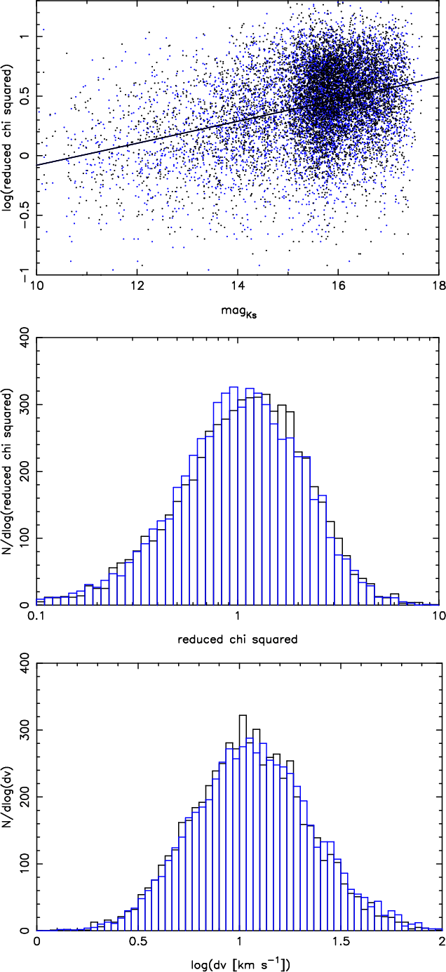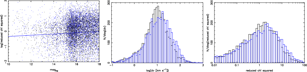 The number stars with proper motions measured in the offset field, after applying the selection criteria, is 4308. In the left panel of Fig. B.1 we show a plot of reduced vs. Ks-band magnitude for the proper motion fits of the offset field