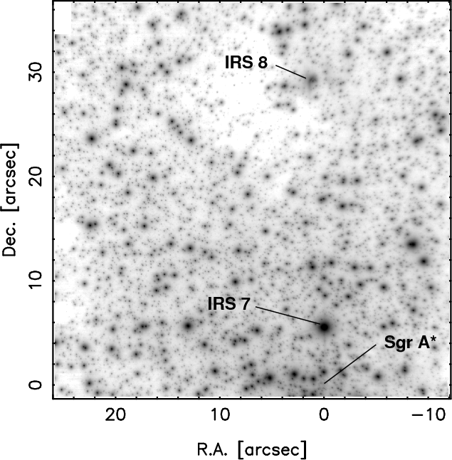 Figure 1: Mosaic image of the observations from 1 June 2006. A logarithmic gray scale has been adopted. The positions of IRS 7 and Sgr A* are indicated. North is up and east is to the left. Offsets in arcseconds from Sgr A* are indicated. Note that this mosaic image is only roughly astrometric. A constant pixel scale of 0.027'' per pixel has been assumed. Any residual net rotation of the image derotator has not been determined, i.e. the image may have a non-zero rotation angle (<1 deg). This may lead to offsets of up to a few tenths of arcseconds near the edge of the field. |