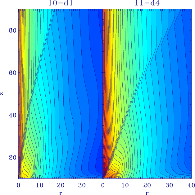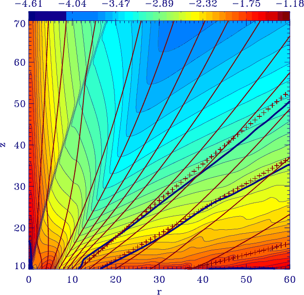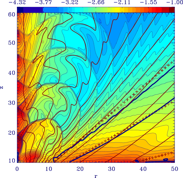 Concerning the ADO model, its main feature is the formation of a shock in the super fast magnetosonic region. Upstream of this shock, the analytical and the asymptotic numerical solutions are basically coincident, while the downstream flow converges to a consistent physical solution, overcoming the singularity of the analytical model at the symmetry axis (first achieved in Gracia et al. 2006). This shock corresponds to the numerically modified fast magnetosonic separatrix surface (FMSS, Tsinganos et al. 1996) that causally disconnects the downstream flow from its launching region. This property is quite robust to variation of the physical parameters, and has been recently confirmed also in Stute et al. (2008), where an outer radial truncation of the disk wind was imposed in the simulations. Moreover, a particular model was initialized by specifying a sub modified fast solution both at the initial conditions and at the boundaries (i.e. a flow causally connected throughout the whole computational domain). Over time, the shock was still found, with its position marking the FMSS that causally separates the upstream and downstream regions.