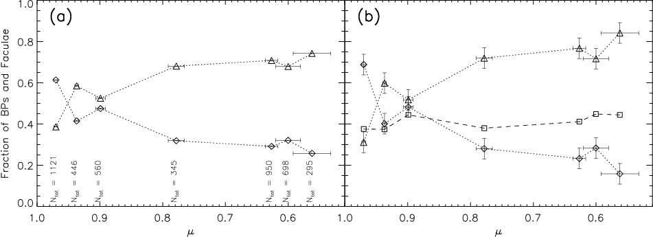Results. We thus obtained a Center-to-Limb Variation (CLV) of the relative number of BPs and faculae, revealing the predominance of faculae at all disk positions except close to disk center (