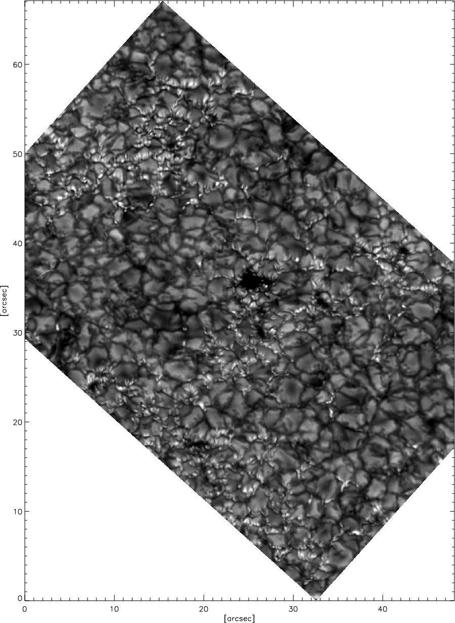 simultaneous image pairs (G-band and continuum) were aligned and destretched using cross-correlation and grid warping techniques (courtesy Sütterlin). The direction of the closest limb was found by comparison with roughly co-temporal SOHO/MDI full disk continuum images, and the images were divided by the limb darkening