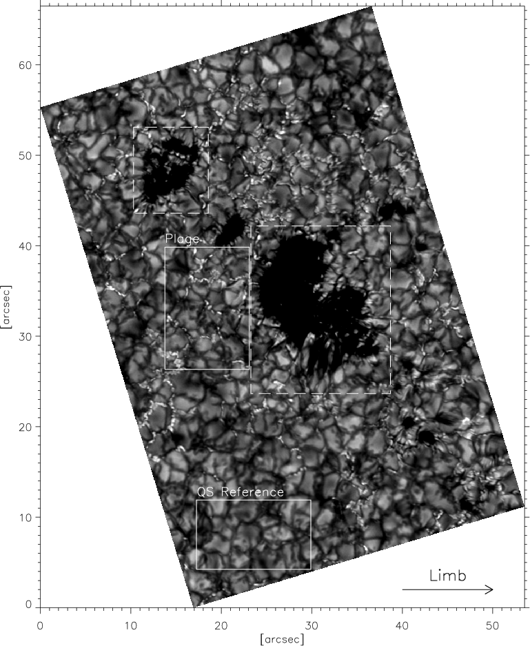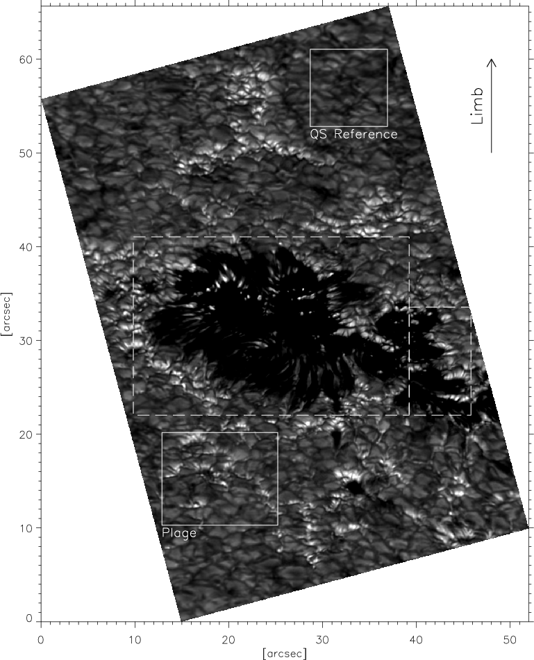 respectively, in which the quiet Sun contrast reference and the masked out sunspot and pore areas are outlined.