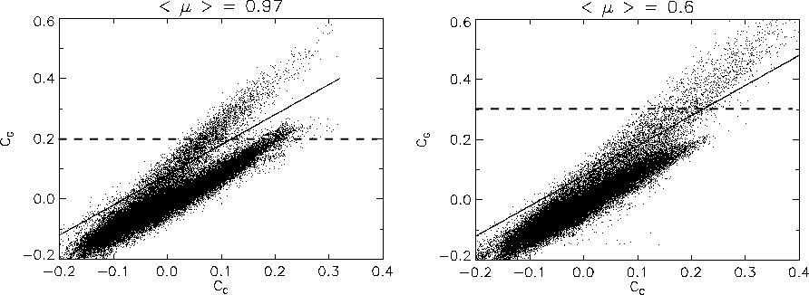 of the chosen plage subfields). As can be seen in Fig. 3, the scatterplot splits into two clearly distinct pixel distributions. A similar pattern appears in the diagnostics of radiative MHD simulations of Shelyag et al. (2004), where the upper distribution is shown to be associated with strong flux concentrations, whereas the lower one corresponds to weakly magnetized granules (see also Sánchez Almeida et al. 2001, for the comparison of different 1D LTE atmospheres). We can thus select pixels which are G-band bright and likely to be of magnetic