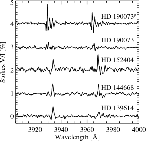 luminosity and projected rotation velocity. In the Stokes V spectra of HD 190073, the profiles